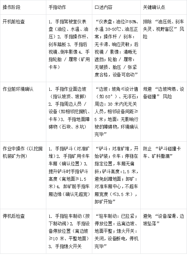 露天礦設(shè)備體積大、作業(yè)環(huán)境復(fù)雜(含邊坡、交叉作業(yè)、惡劣天氣),手指口述核心聚焦“設(shè)備狀態(tài)、周邊環(huán)境、操作聯(lián)動” 三大維度,避免碰撞、傾翻、設(shè)備故障等風(fēng)險。