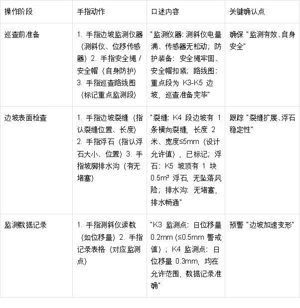 邊坡是露天礦山重大危險源,巡查工手指口述需聚焦“邊坡變形、浮石、排水系統(tǒng)”,通過 “定點、定標、定量” 確認,及時發(fā)現(xiàn)邊坡失穩(wěn)前兆。