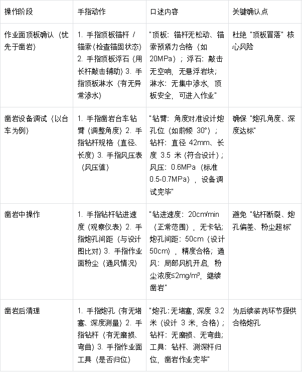 地下鑿巖作業(yè)空間狹窄、粉塵多、存在頂板冒落風(fēng)險,手指口述核心是“頂板安全、設(shè)備參數(shù)、炮孔精度”,避免頂板事故和鑿巖偏差。