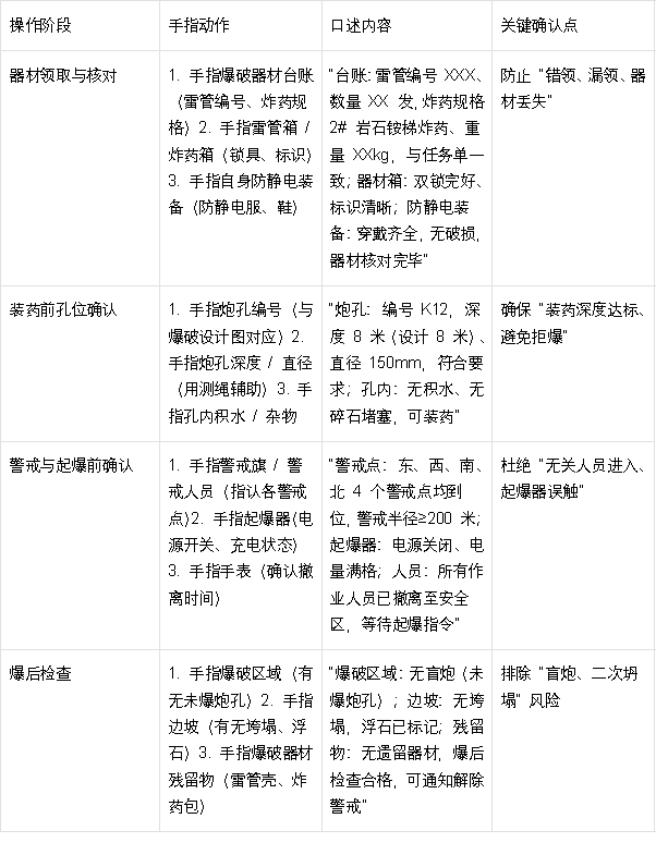 爆破作業(yè)是露天礦山高風(fēng)險環(huán)節(jié),手指口述需覆蓋“爆破器材管理、裝藥連線、警戒撤離、爆后檢查” 全流程,核心是 “數(shù)量核對、位置精準、安全距離合規(guī)”。