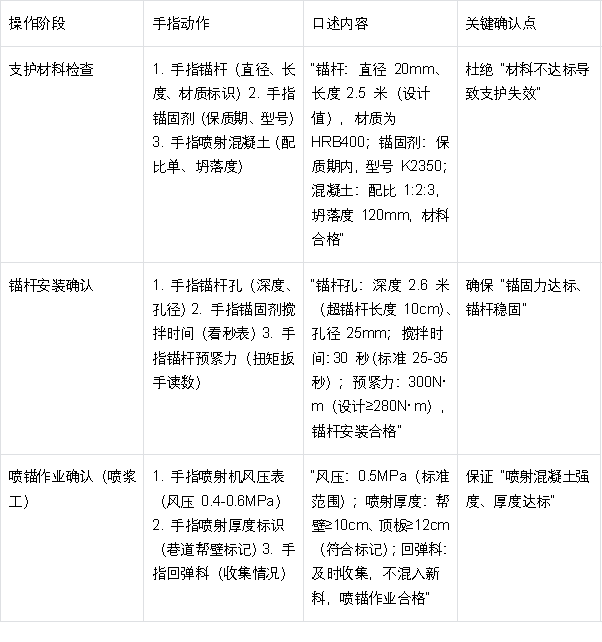 支護是地下礦山“保命工程”,手指口述需覆蓋 “支護材料、錨固參數(shù)、施工質(zhì)量”,確保支護強度滿足巷道穩(wěn)定要求。