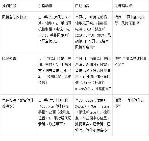 地下礦山通風(fēng)直接關(guān)系有毒有害氣體(CO、NO?)和粉塵濃度,通風(fēng)工手指口述聚焦 “風(fēng)機運行、風(fēng)路暢通、氣體檢測”。